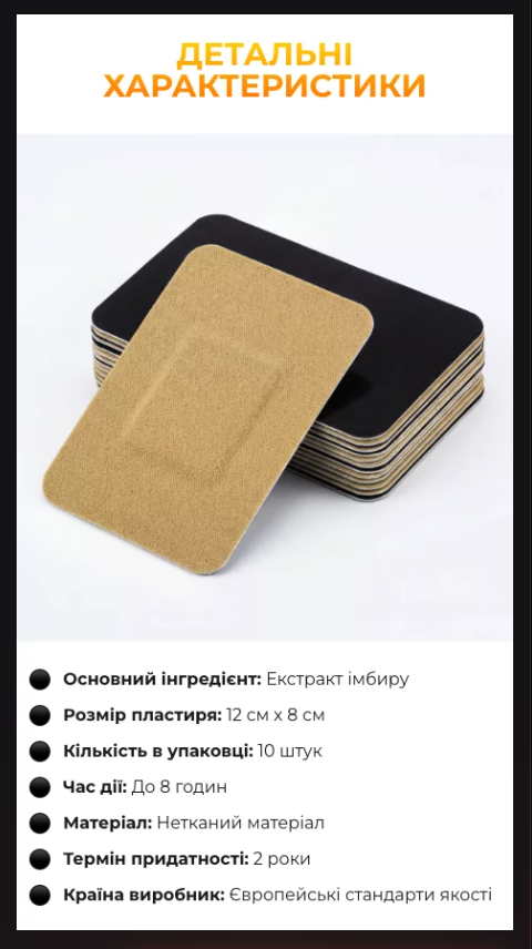 Клеїв пластир на лікоть після роботи — постійно болів суглоб. Приємне тепло з’явилося вже за кілька хвилин, біль реально відпустив. Тримався майже весь день, не відклеювався. Дуже задоволений, замовлю ще.